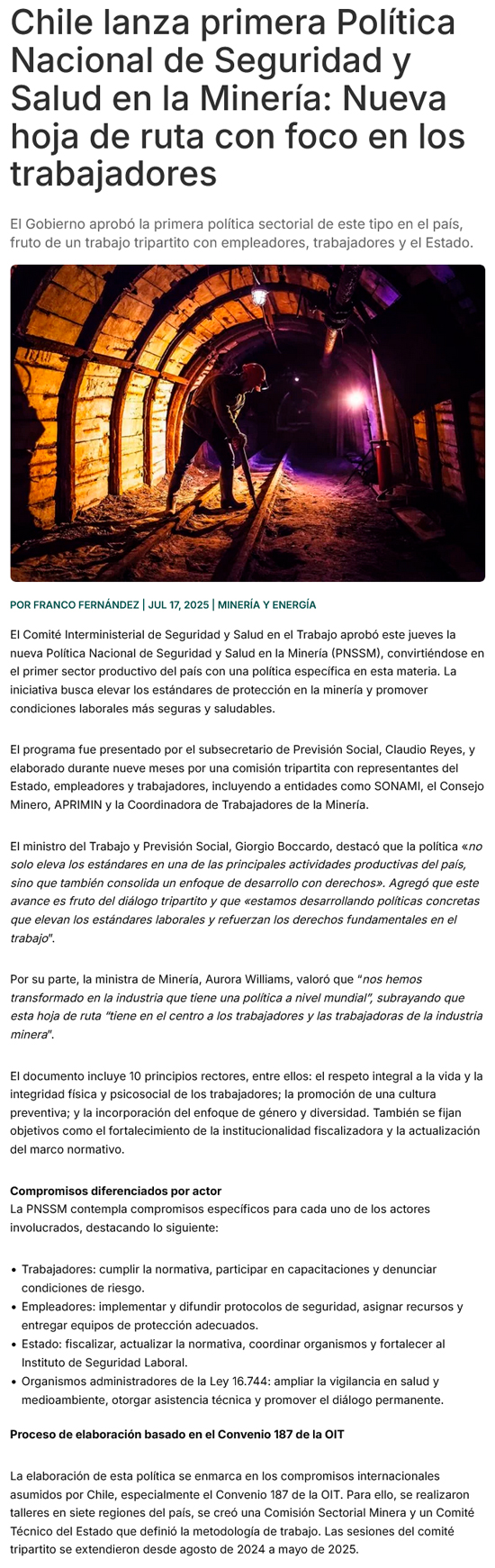 Gobierno aprueba Política Nacional de Seguridad y Salud en la Minería - (mch.cl)