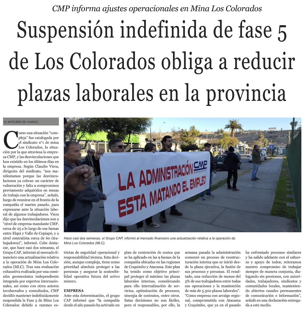 CMP utilizará acopios alternativos para mitigar efectos de suspensión de fase 5 de Los Colorados - (El Noticiero del Huasco)
