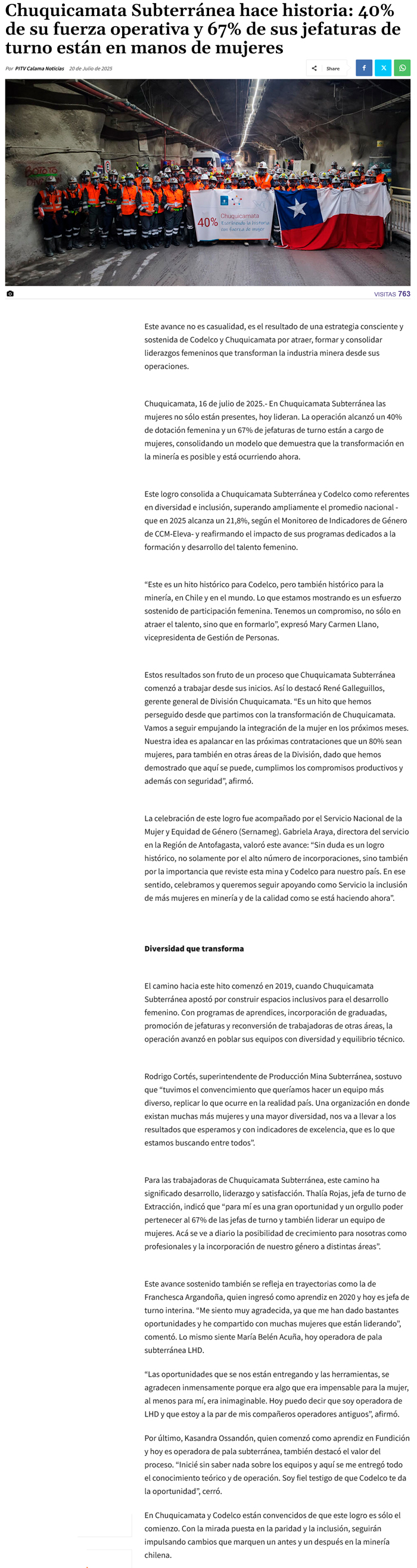 Chuquicamata Subterránea hace historia: 40% de su fuerza operativa y 67% de sus jefaturas de turno están en manos de mujeres - (fm7.cl)