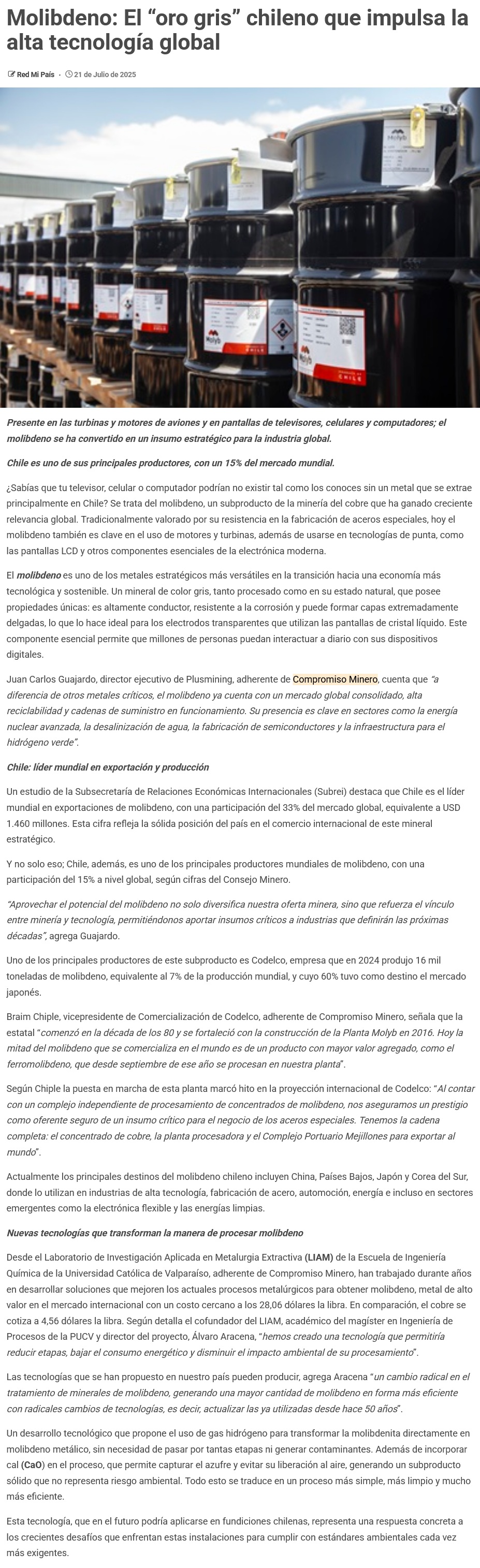 Molibdeno: El «oro gris» chileno que impulsa la alta tecnología global - (Maray Online)