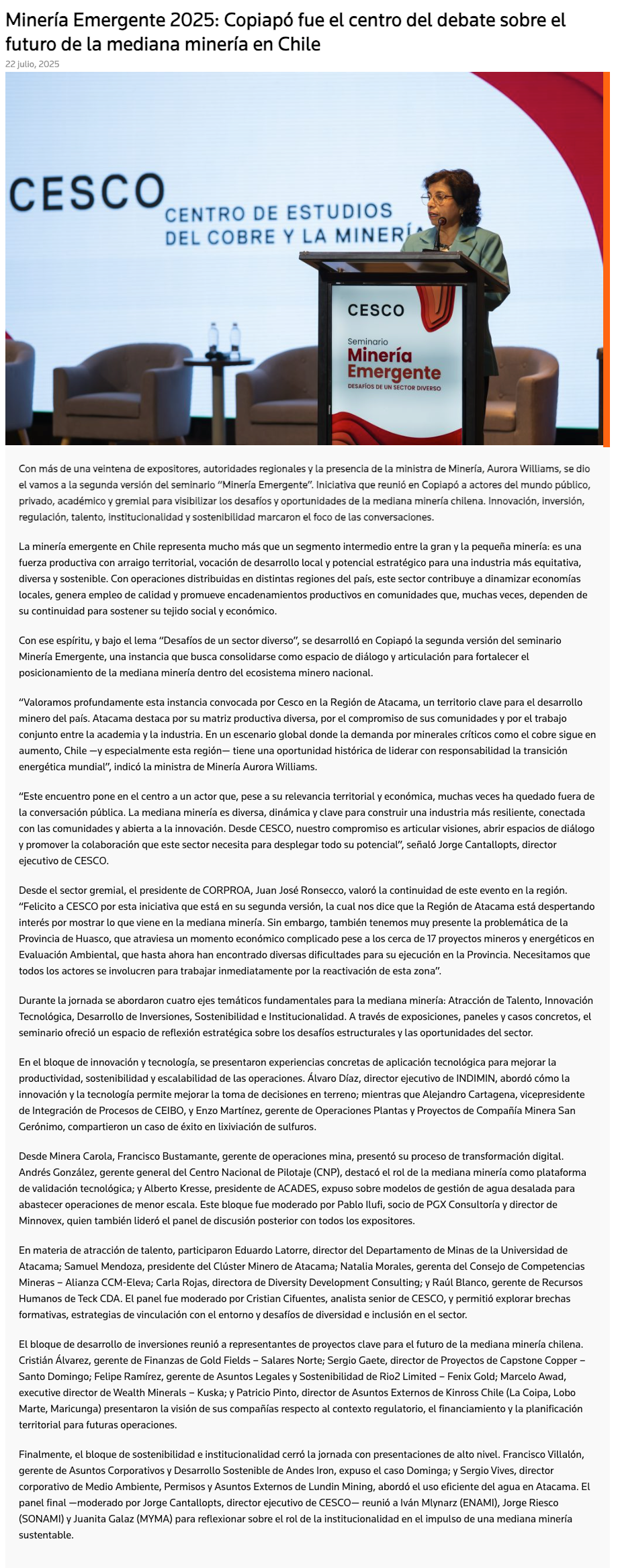 “Desafíos de un sector diverso”: CESCO reúne en Copiapó a protagonistas de la minería emergente en Chile - (madero.cl)
