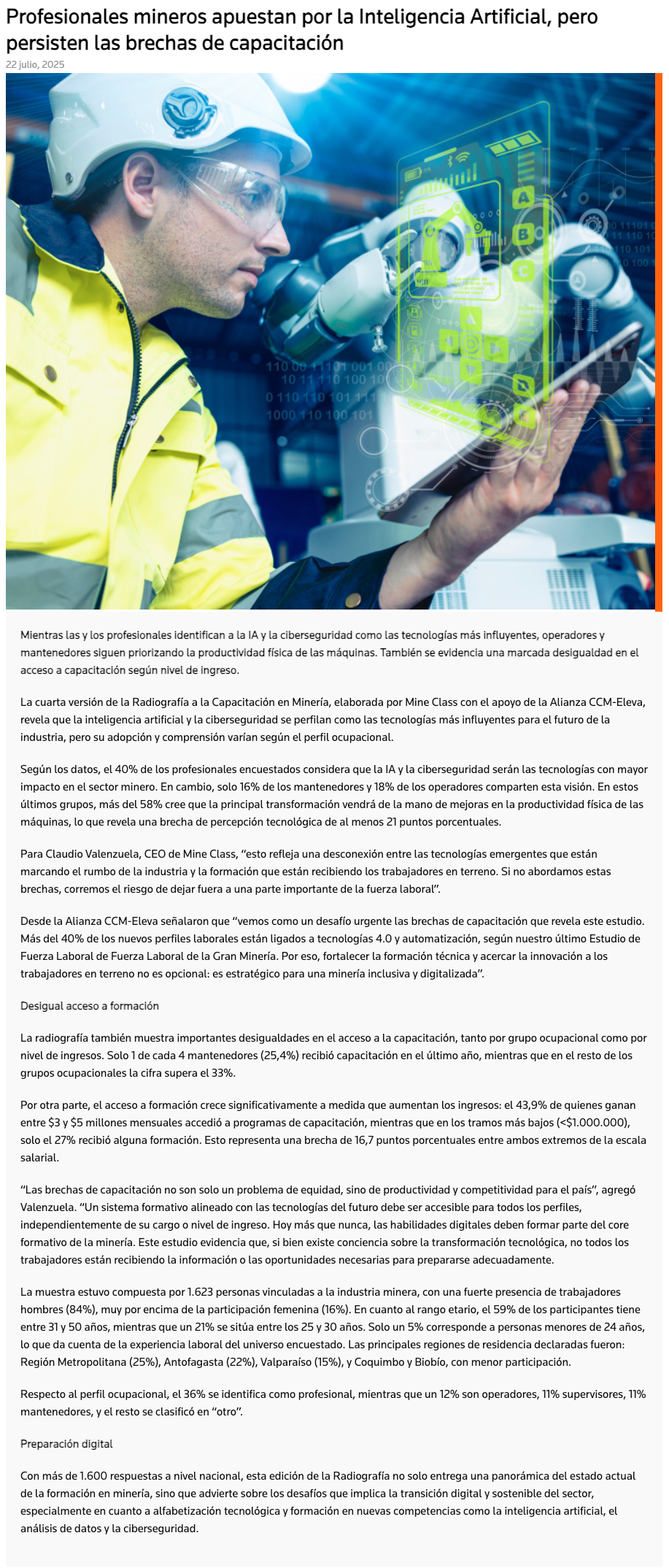 IV Radiografía a la Capacitación en Minería: Profesionales mineros apuestan por la Inteligencia Artificial, pero persisten las brechas de capacitación - (portalinnova.cl)