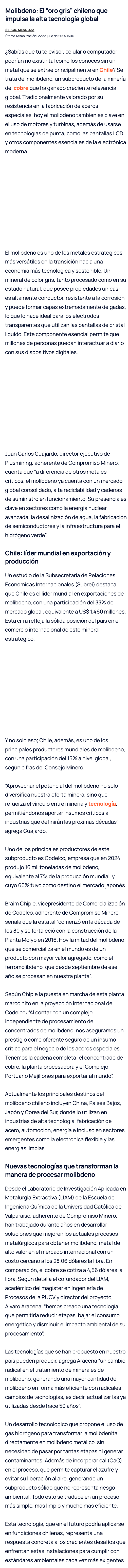 Molibdeno: el “oro gris” chileno subproducto del cobre que impulsa la alta tecnología global - (revistacrisol.cl)