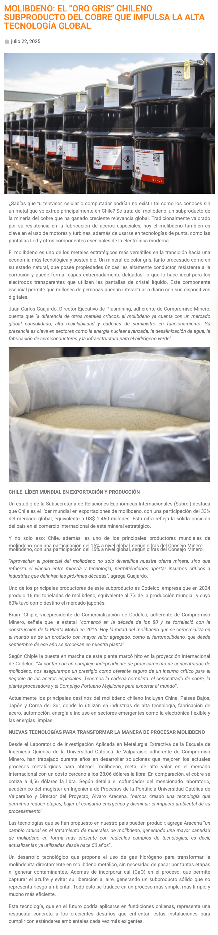 Molibdeno: El “oro gris” chileno que impulsa la alta tecnología global - (redimin)