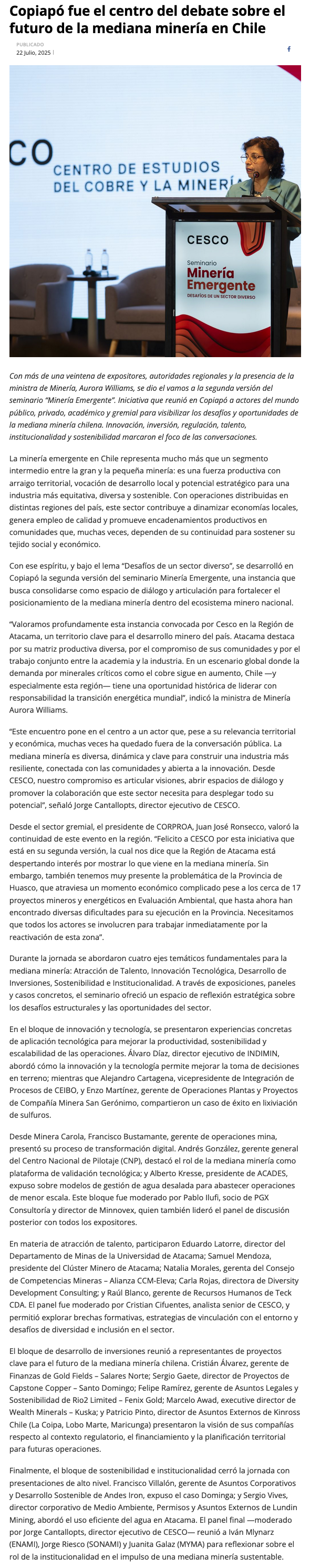 “Desafíos de un sector diverso”: CESCO reúne en Copiapó a protagonistas de la minería emergente en Chile - (madero.cl)