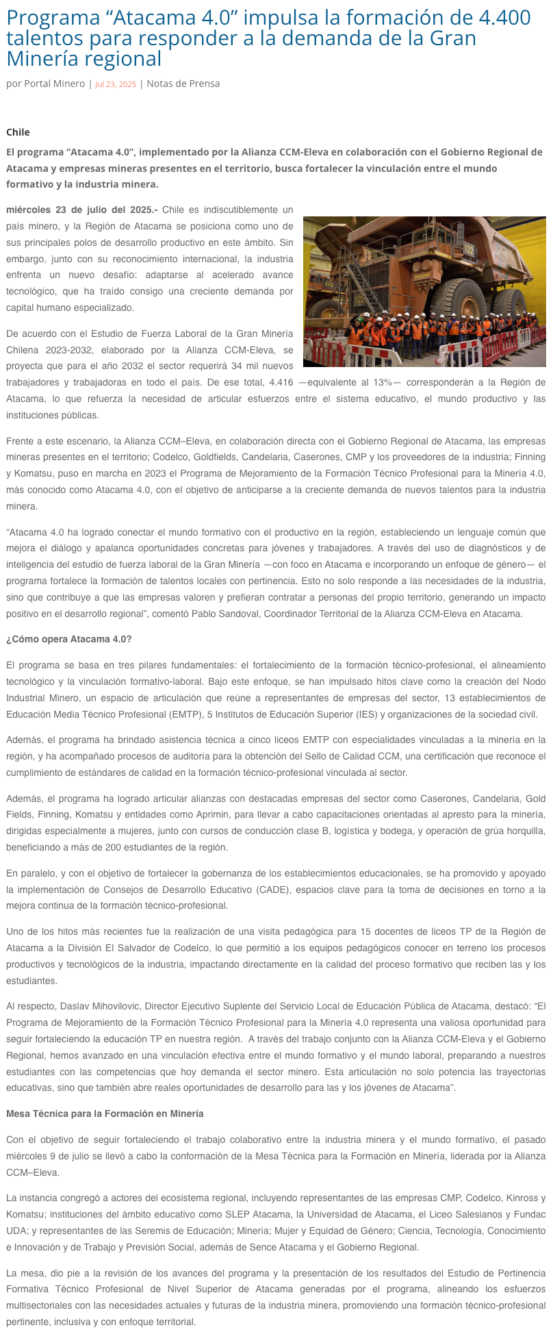 “Atacama 4.0” impulsa formación de 4.400 talentos para responder a demanda de la Gran Minería regional - (guiaminera.cl)