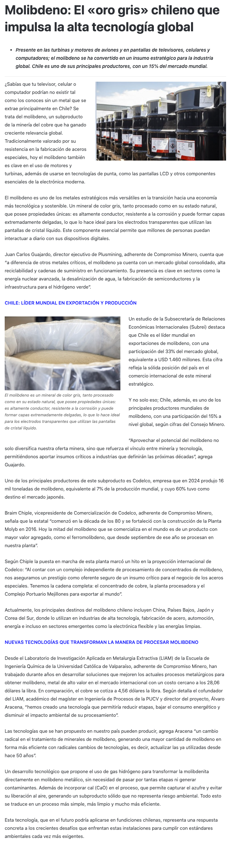 Molibdeno: El «oro gris» chileno que impulsa la alta tecnología global - (portalinnova.cl)