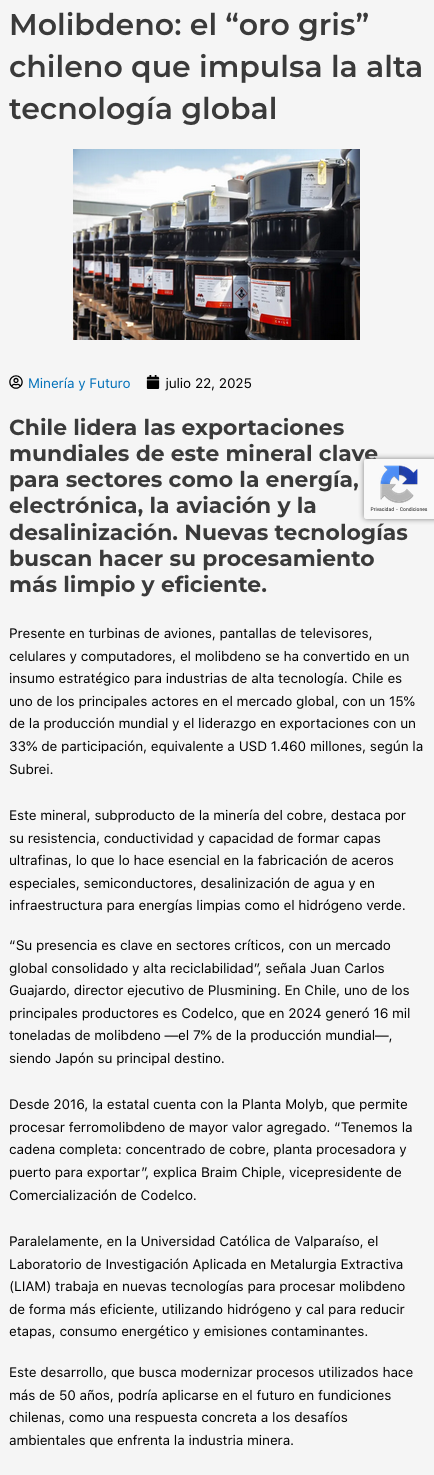 Molibdeno: El «oro gris» chileno que impulsa la alta tecnología global - (portalinnova.cl)