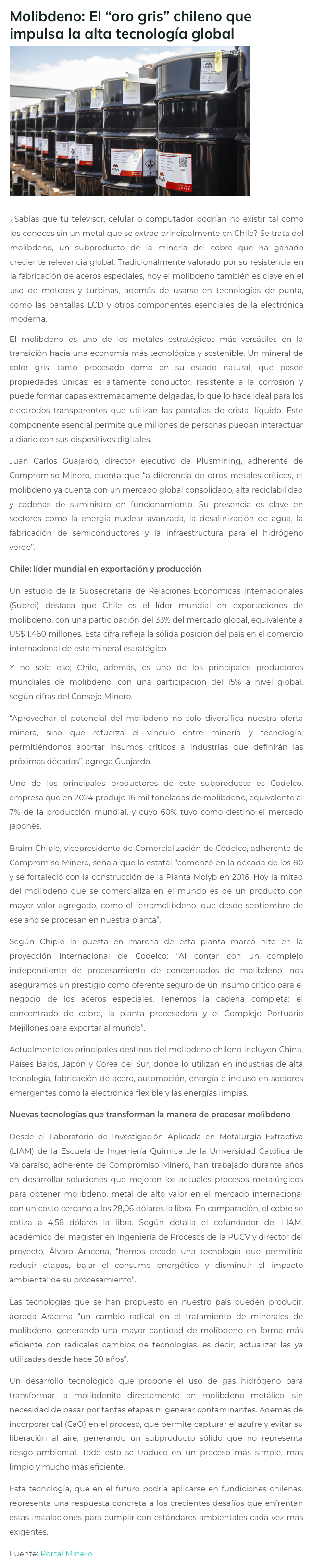 Molibdeno: El «oro gris» chileno que impulsa la alta tecnología global - (portalinnova.cl)