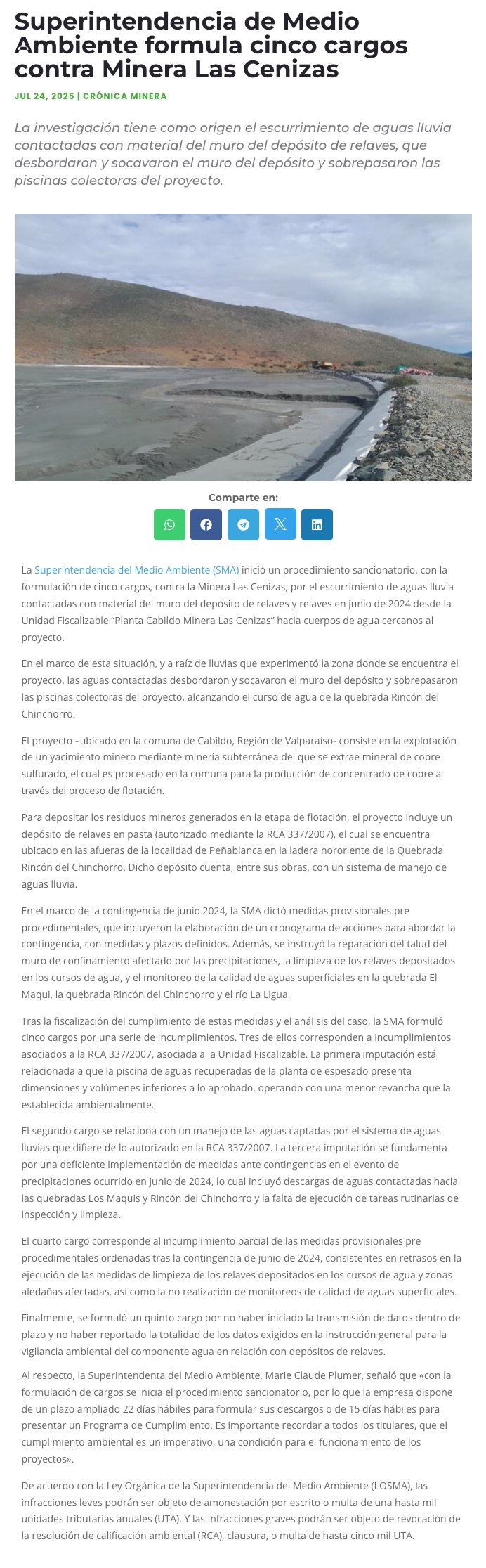 SMA formula cargos contra Minera Las Cenizas - (Pulso)