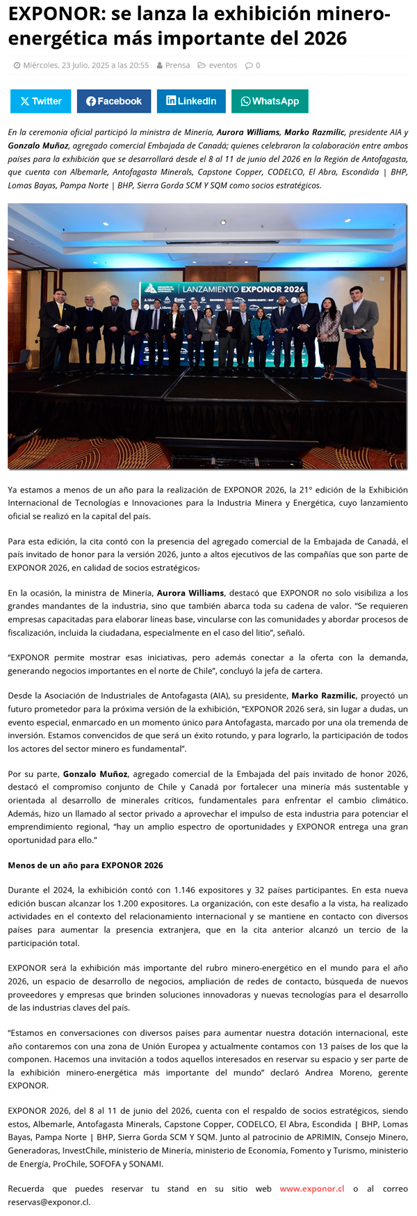 Se realiza lanzamiento de Exponor, la exhibición minero-energética más importante del 2026 - (antofagastaonline.cl)