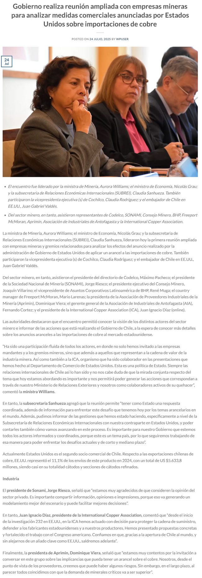 Gobierno realiza reunión ampliada con empresas mineras para analizar medidas comerciales anunciadas por Estados Unidos sobre importaciones de cobre - (radiomontecarlo.cl)