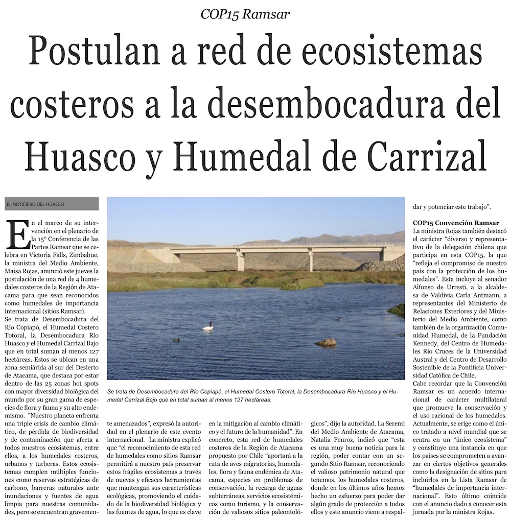 COP15 Ramsar: Chile postula red de ecosistemas costeros de Atacama como humedales de importancia internacional - (El Diario de Atacama)