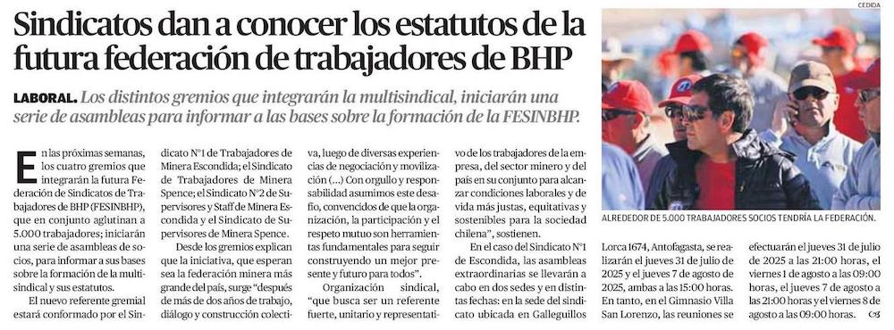 Sindicatos dan a conocer los estatutos de la futura federación de trabajadores de BHP - (El Mercurio de Antofagasta)