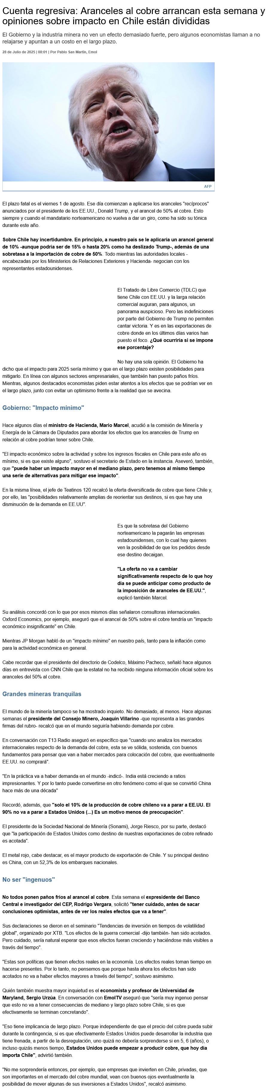 Cobre chileno bajo presión: Estados Unidos activa aranceles del 50% - (eldiariodesantiago.cl)