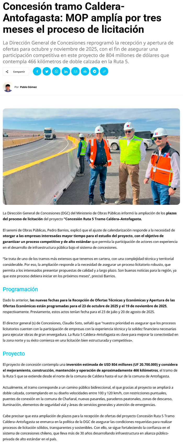 Amplían licitación de ruta Ruta 5 tramo "Caldera-Antofagasta" - (La Estrella)