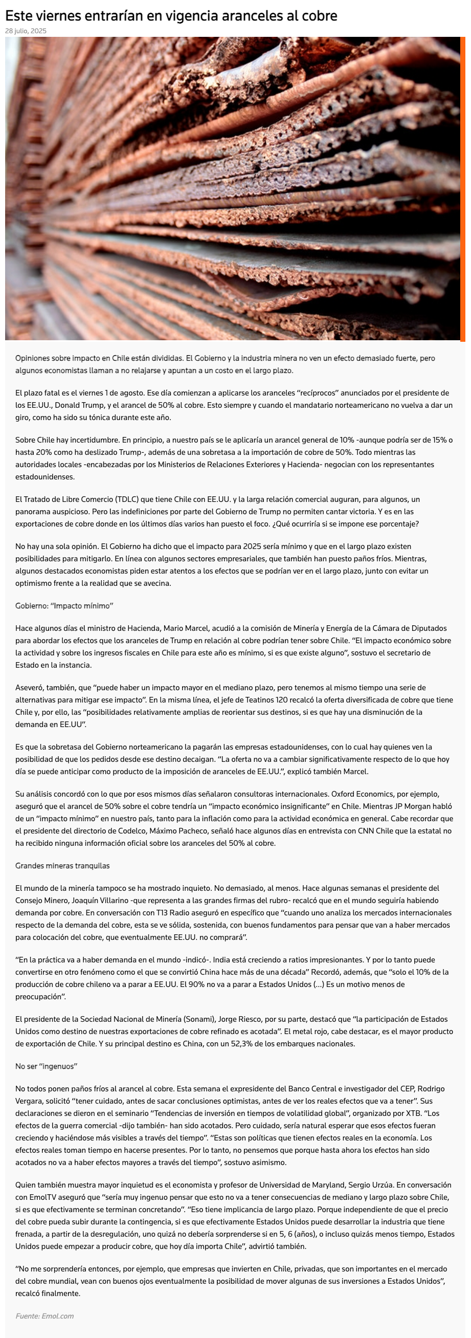 Cuenta regresiva: Aranceles al cobre arrancan esta semana y opiniones sobre impacto en Chile están divididas - (emol)