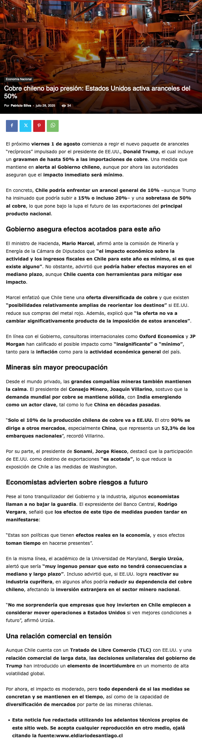 Cuenta regresiva: Aranceles al cobre arrancan esta semana y opiniones sobre impacto en Chile están divididas - (emol)