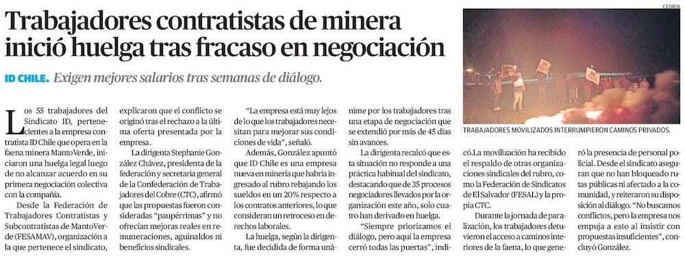 Trabajadores de Sindicato I.D. en Mantoverde votan la huelga tras fracaso en negociaciones con la empresa - (subelaradio.cl)