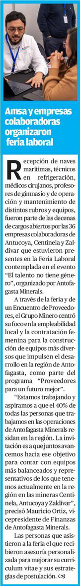 Antofagasta Minerals se propone superar el 40% de mano de obra local en la región - (El Mercurio de Calama)