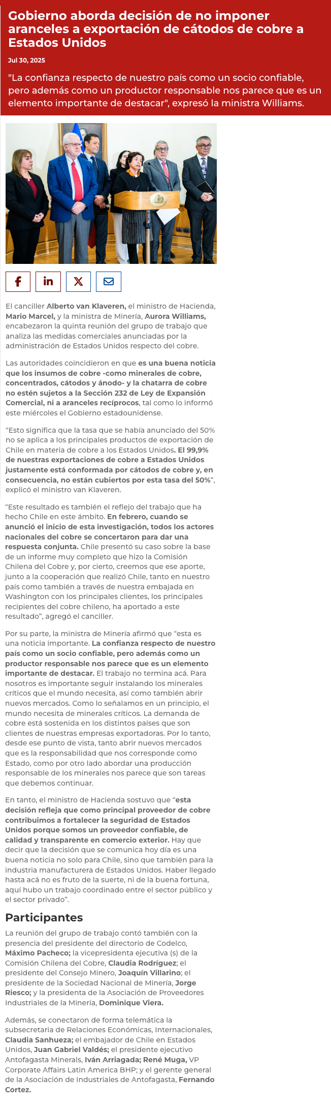 Gobierno celebró decisión de EEUU de excluir al cobre chileno de nuevos aranceles - (infogate.cl)