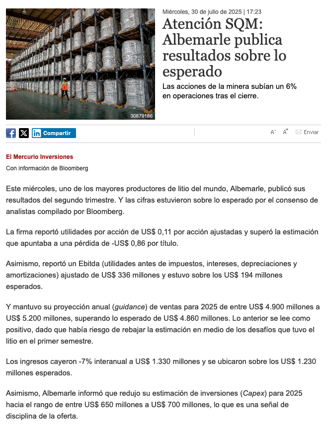 Albemarle deja atrás las pérdidas y resalta su plan ante la caída sostenida del precio del litio - (Pulso)