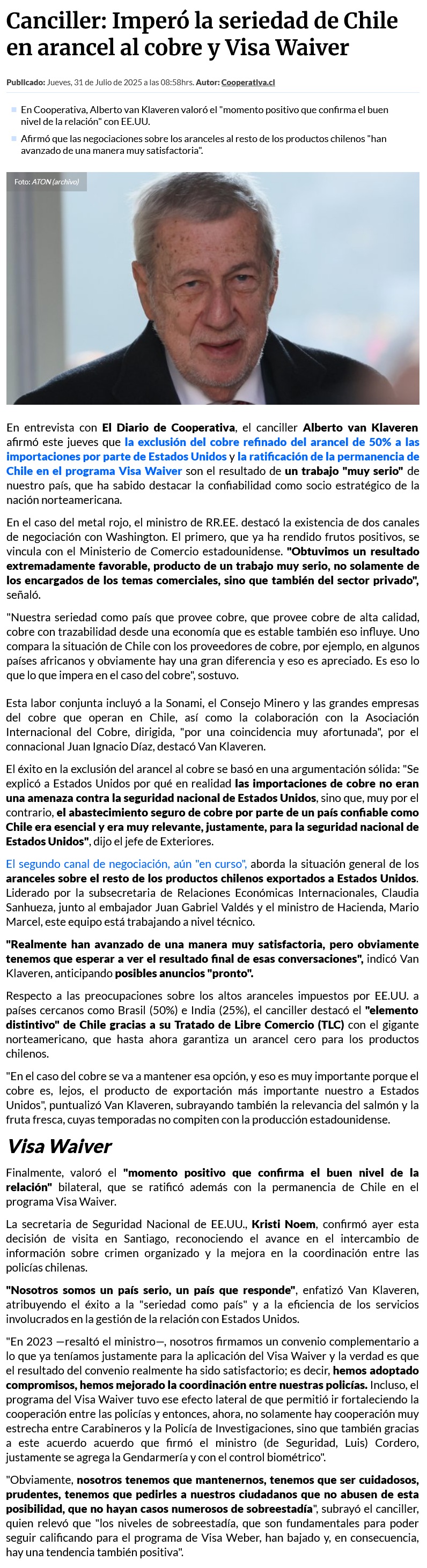 Canciller destacó la "seriedad de Chile" tras exclusión del cobre de aranceles y permanencia en Visa Waiver - (soychile)