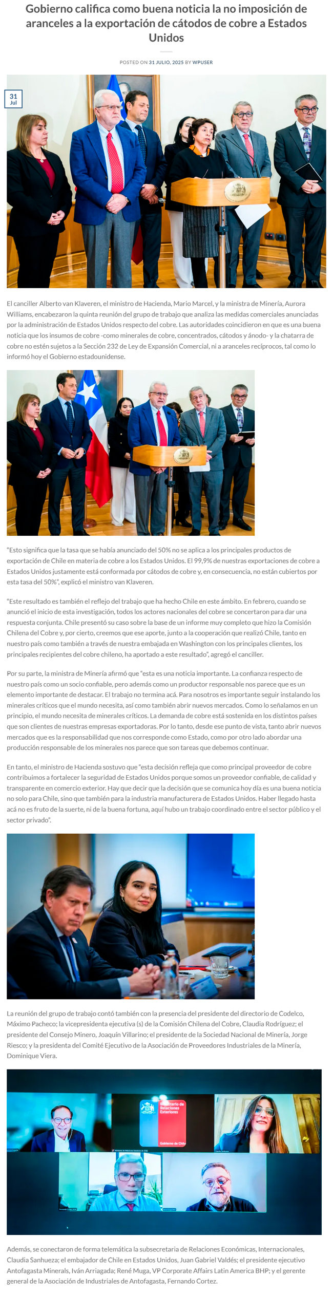 Gobierno celebró decisión de EEUU de excluir al cobre chileno de nuevos aranceles - (infogate.cl)