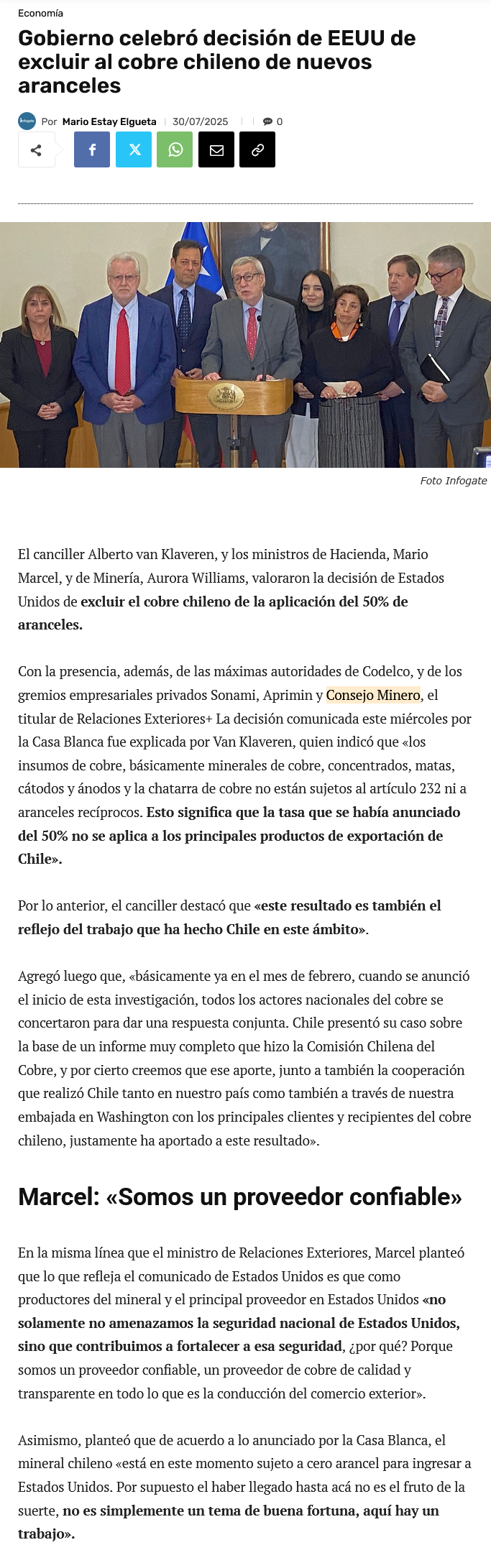 Gobierno califica como buena noticia la no imposición de aranceles a la exportación de cátodos de cobre a Estados Unidos - (mvcomunicaciones.cl)