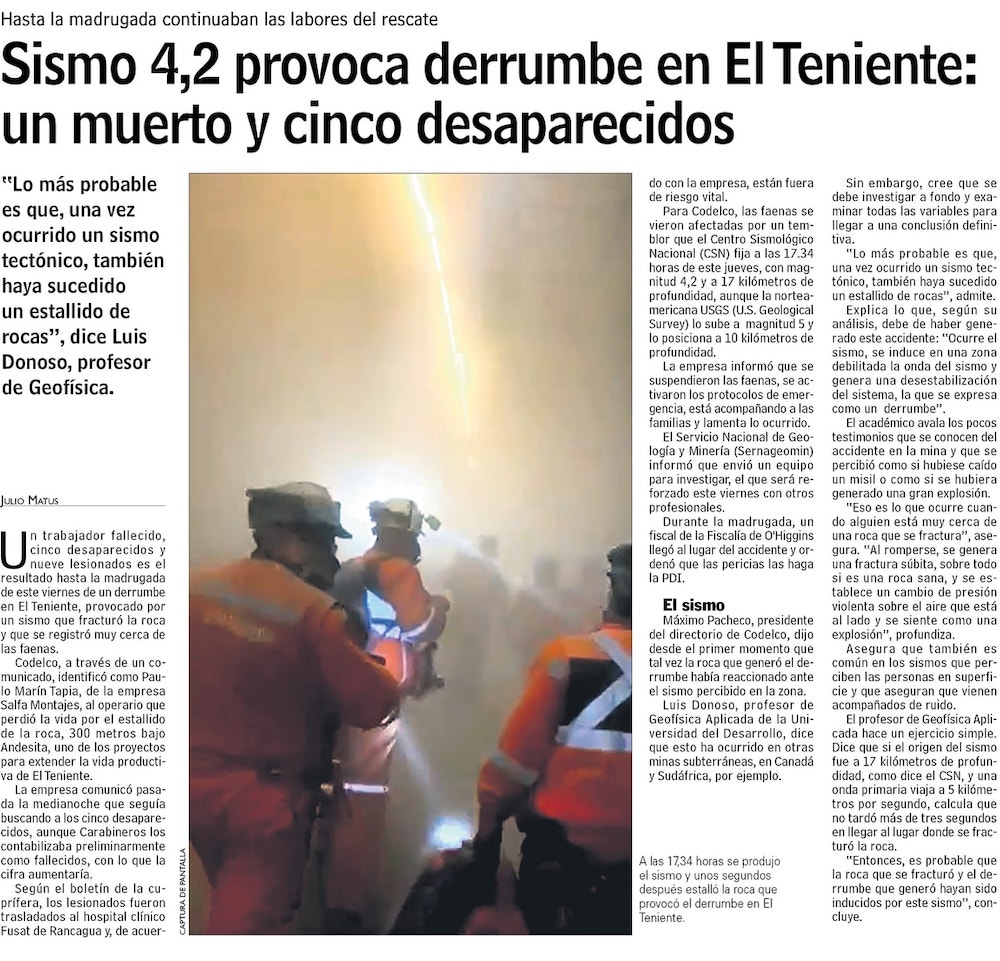 Derrumbe deja un trabajador fallecido, nueve heridos y cinco mineros desaparecidos en la División El Teniente de Codelco - (El Mercurio de Santiago)