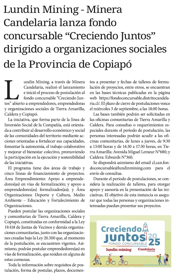 Creciendo Juntos 2024: Lundin Mining lanza fondo concursable para emprendedores y organizaciones sociales - (madero.cl)