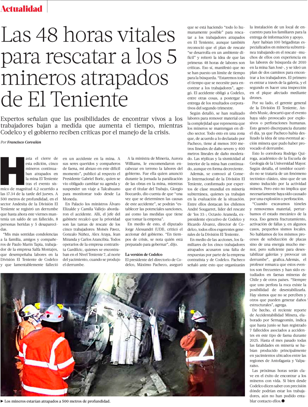 Codelco convoca a expertos que estuvieron en rescate de “Los 33” para avanzar hacia derrumbe en El Teniente - (El Mercurio de Santiago)