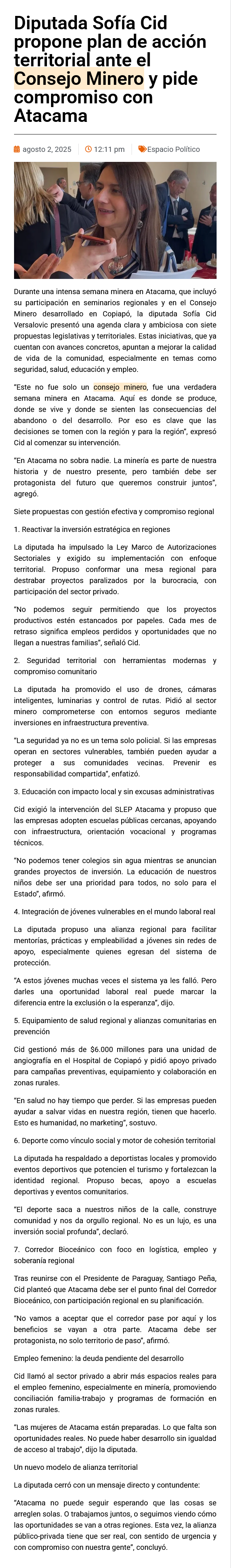 Diputada Sofía Cid propone plan de acción territorial ante el Consejo Minero y pide compromiso con Atacama - (Nostálgica Online)
