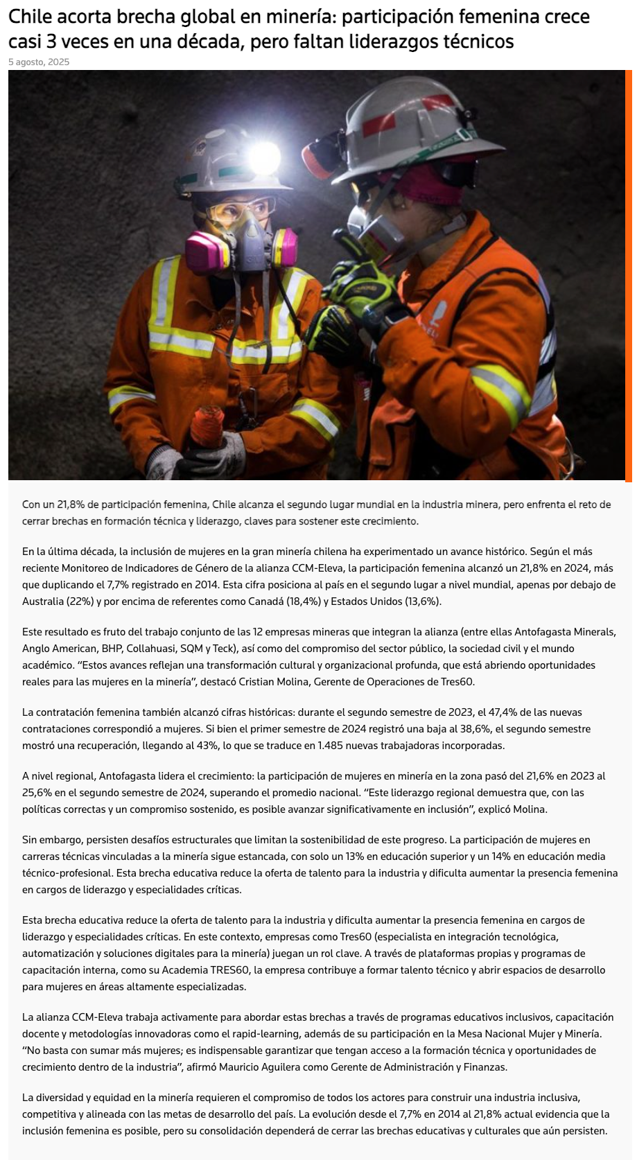 Chile escala al segundo lugar mundial en participación femenina en minería, pero enfrenta desafíos en formación técnica - (mineriayfuturo.cl)