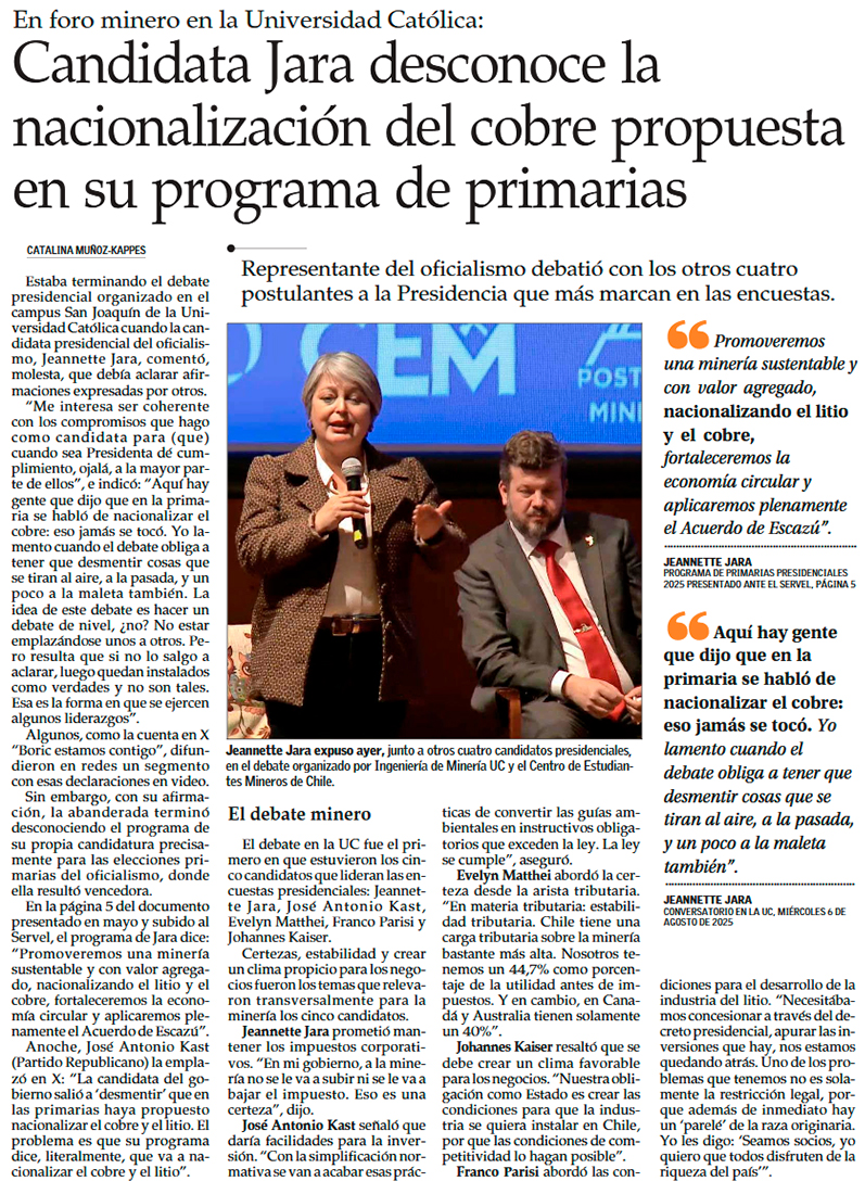 Foro minero: Kast y Kaiser afirman que harán concesible el litio, Matthei apunta a la permisología y Jara dice que no modificará impuestos - (Pulso)