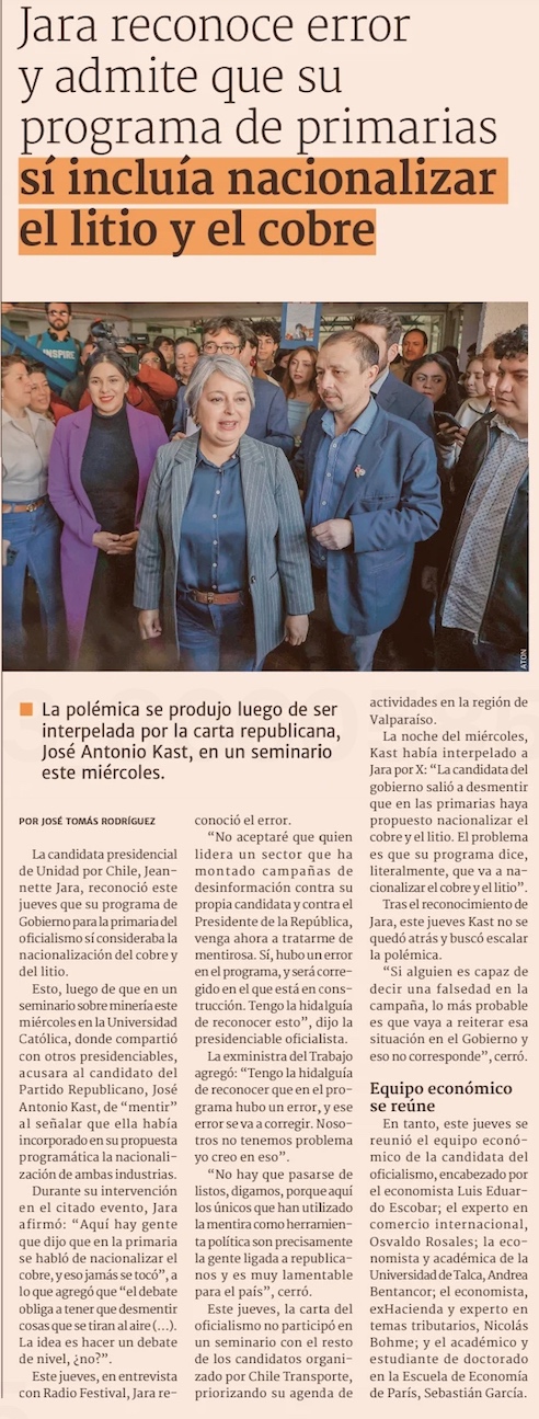 Luego de negar plan para nacionalizar el cobre, Jara dice que se trató de un error en su programa de primarias - (El Mercurio de Santiago)