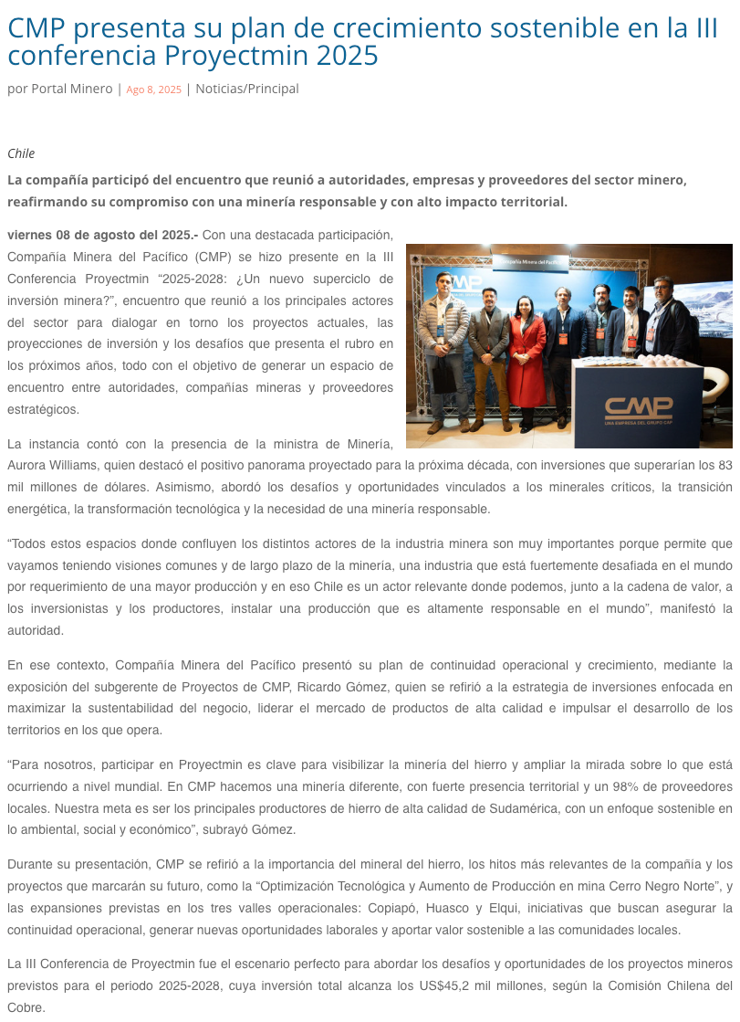 CMP presenta su Plan de Crecimiento Sostenible en la Il conferencia PROYECTMIN 2025 - (Semanario Tiempo)