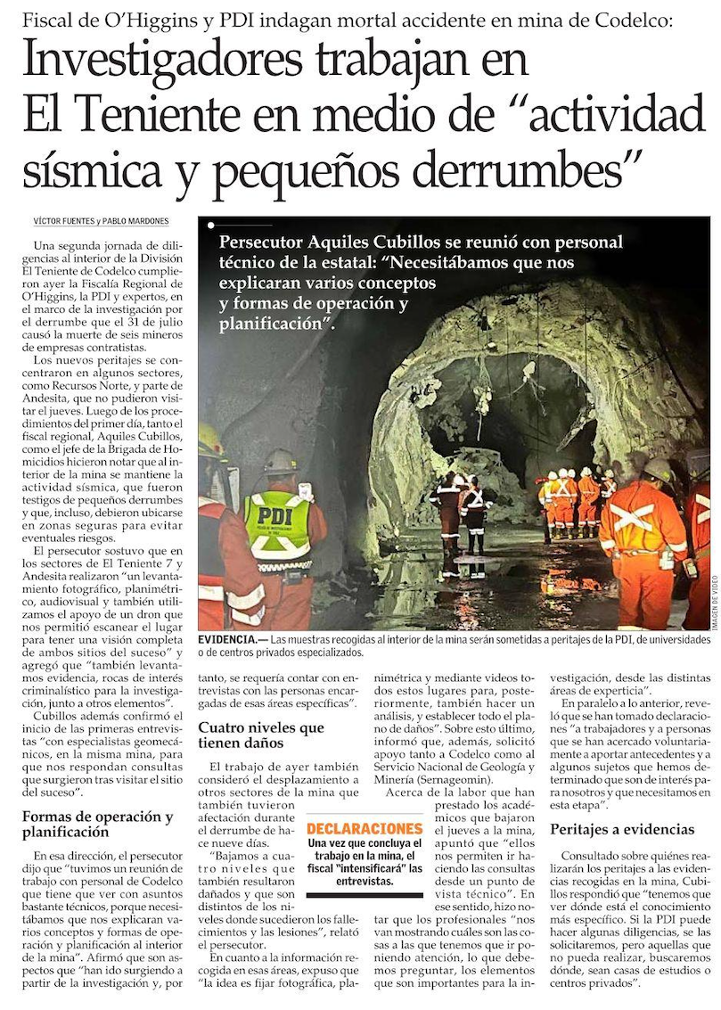 Fiscalía inspecciona cuatro niveles dañados en mina El Teniente tras tragedia - (La Tercera)