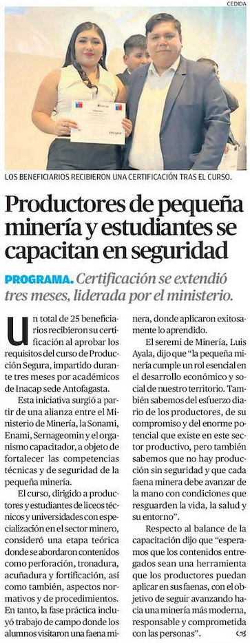 Ofrece 20 cursos de capacitación a pequeños productores mineros: seguridad es uno de los ejes - (El Noticiero del Huasco)