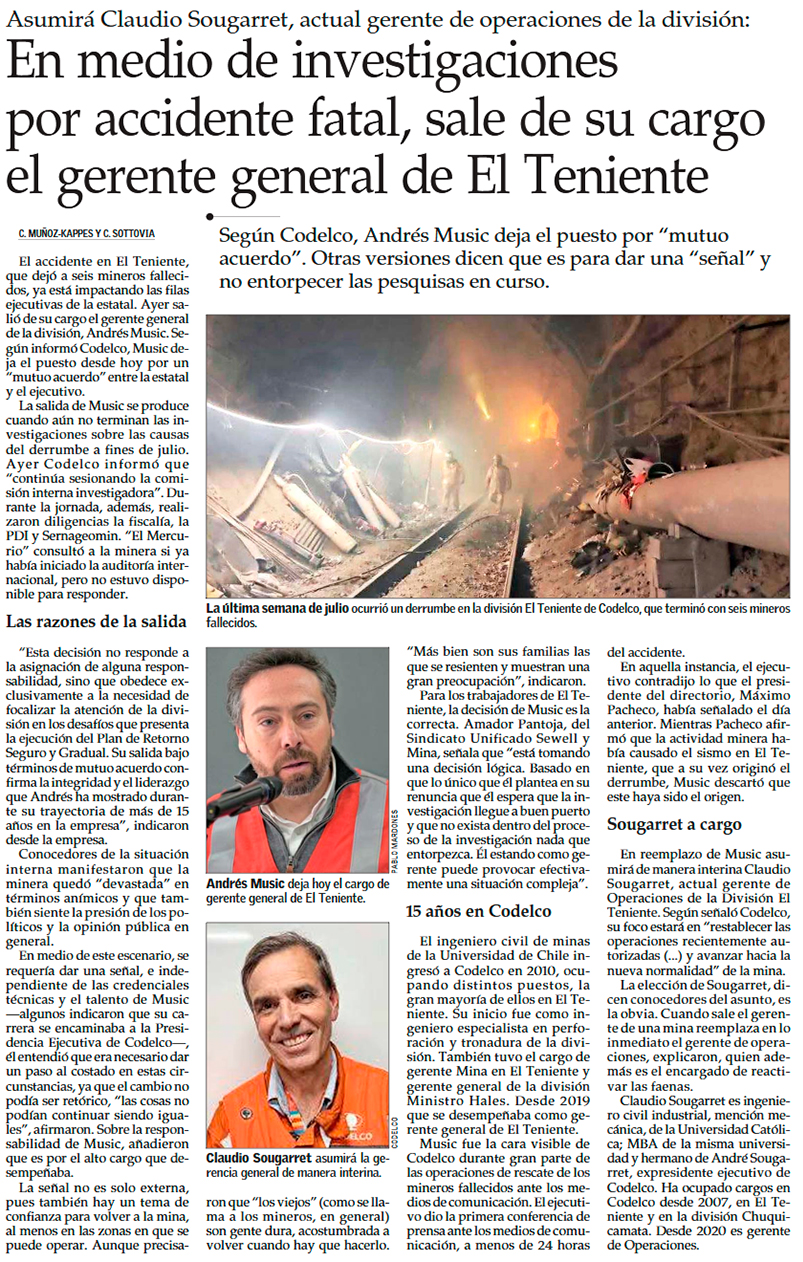 Tras tragedia en El Teniente, Codelco saca a gerente general de El Teniente y nombra a Claudio Sougarret en su reemplazo - (Diario Financiero)