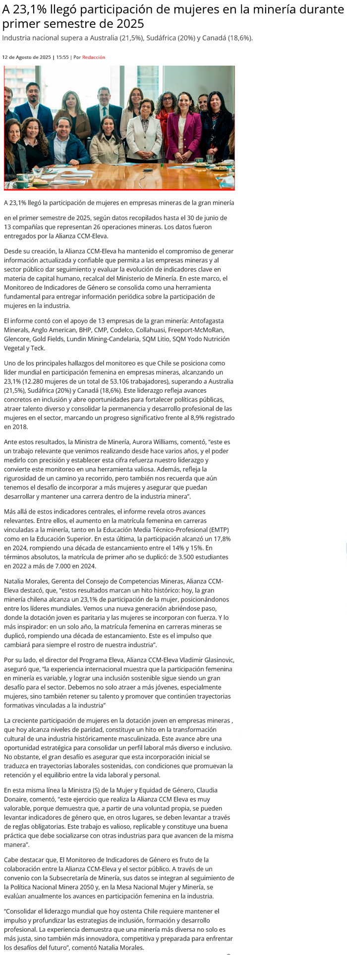 Industria minera chilena lidera participación de mujeres a nivel mundial - (mch.cl)