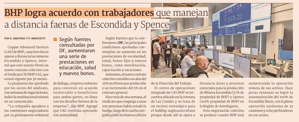 CAS de BHP alcanza acuerdo con sindicato de trabajadores que manejan a distancia las mineras Escondida y Spence - (DF Online)