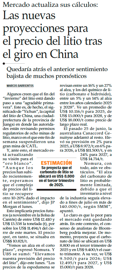 Las nuevas proyecciones para el precio del litio tras el giro en China - (El Mercurio Inversiones)