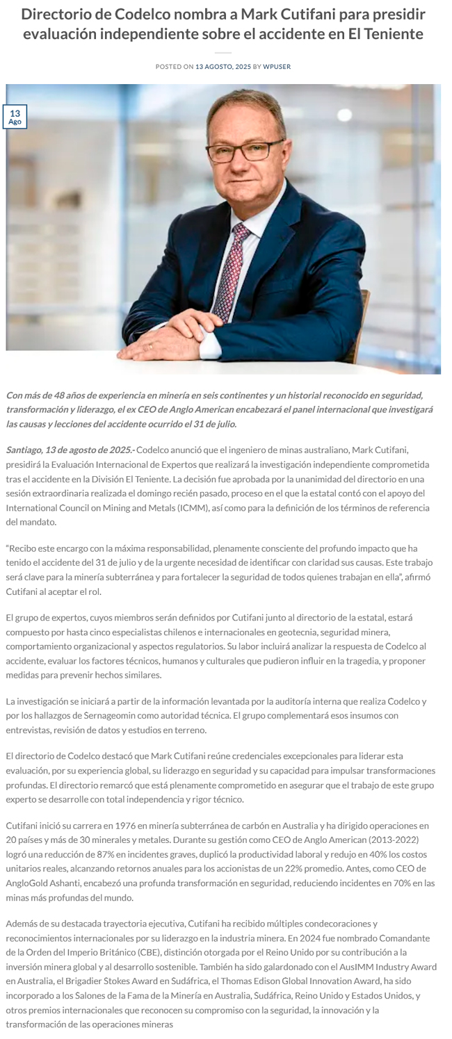 Célebre minero australiano Mark Cutifani liderará investigación internacional del accidente - (Diario Financiero)