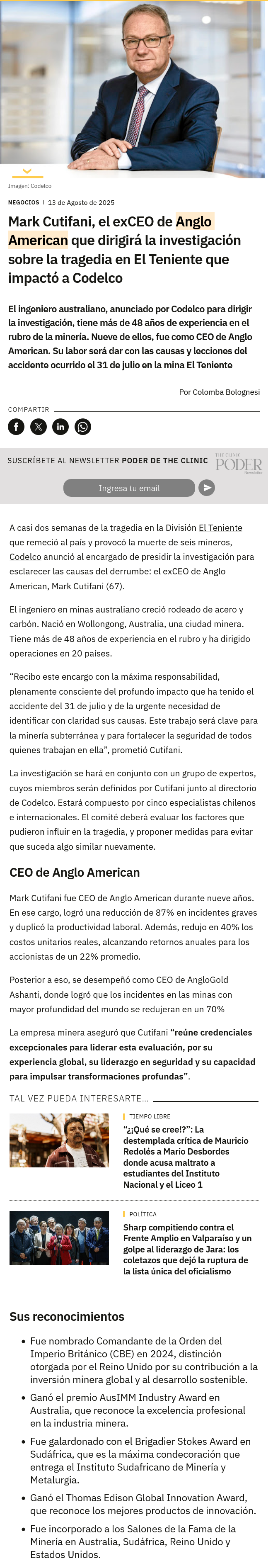 Directorio de Codelco nombra a Mark Cutifani para presidir evaluación independiente sobre el accidente en El Teniente - (mvcomunicaciones.cl)