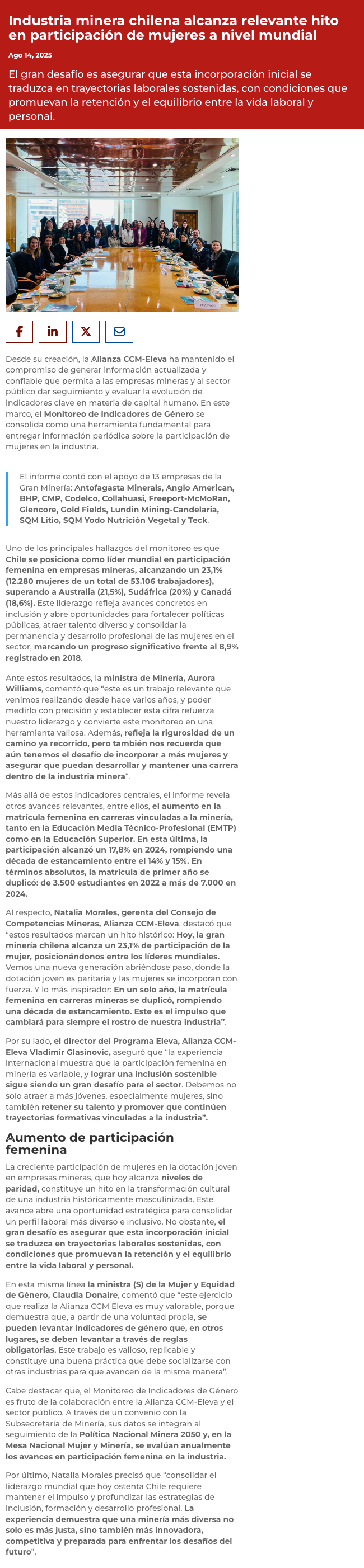 Minería chilena lidera participación de mujeres a nivel mundial - (mvcomunicaciones.cl)
