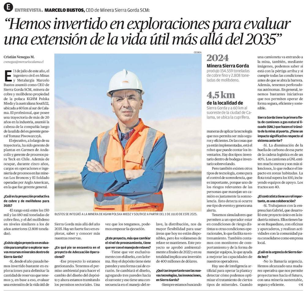 La meta del primer CEO chileno de Minera Sierra Gorda: “Aumentar la vida útil de la mina más allá de 2035” - (Diario Financiero)