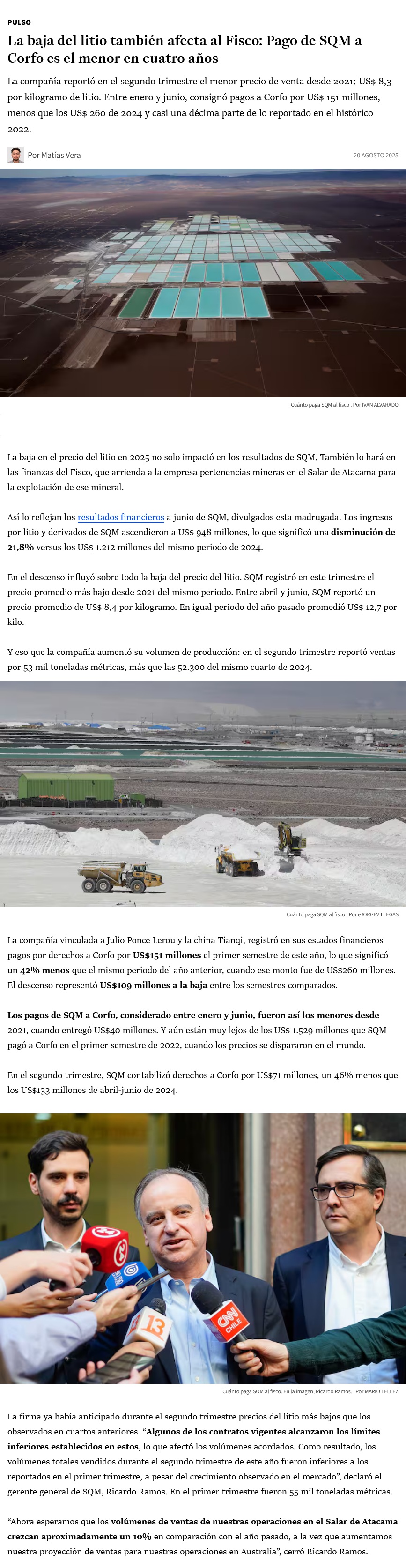 La baja en el precio del litio golpea los resultados de SQM y los aportes a Corfo - (Pulso)