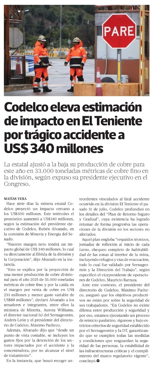 Tragedia en El Teniente golpea en 10% la producción de la división y pérdidas suben a US$ 340 millones - (Diario Financiero)