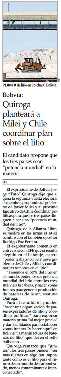 La apuesta de Jorge “Tuto” Quiroga por el litio y su oferta a Chile y Argentina: “Podemos ser potencia mundial entre los tres - (La Tercera)